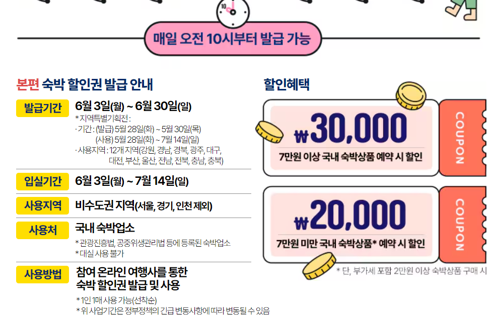 국내여행 할인행사 '여행가는 달' 6월 프로모션으로 2024 대한민국 숙박세일페스타 쿠폰발급을 6/3~6/30일까지 진행합니다. 매일 오전 10시 1인 1매 선착순 발급으로 조기에 마감될 수 있습니다. 아래에 쿠폰발급 사이트별로 정리해놓았으니 사이트 방문하셔서 3만원 할인권 적용하셔서 예약하시면 됩니다. ↓
