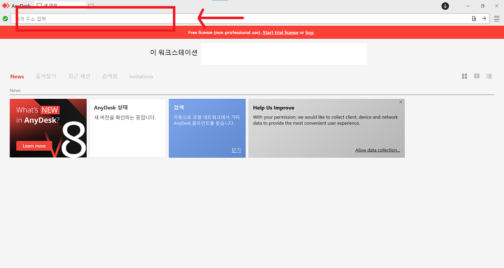 다른 컴퓨터에서 동일하게 애니데스크를 실행합니다. 실행할 컴퓨터에는 당연히 애니데스크 프로그램이 깔려있어야 합니다. 애니데스크 실행 후 윗쪽 빨간색 창에 상대방의 고유 번호(내가 연결하고자 하는 컴퓨터의 9자리 고유번호)를 입력합니다.