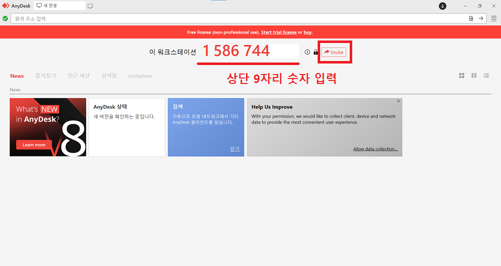 2. 애니데스크를 실행합니다. 상단에 나타나는 9자리 고유 번호가 원격 접속을 위한 주소입니다. 9자리 고유번호 옆의 invete 버튼을 클릭하여 원격연결할 사용자를 초대합니다.
